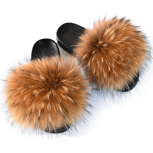 Jaxmonoy Women Summer Fluffy Real Fox Fur Slides Genuine Raccoon Fur Slippers