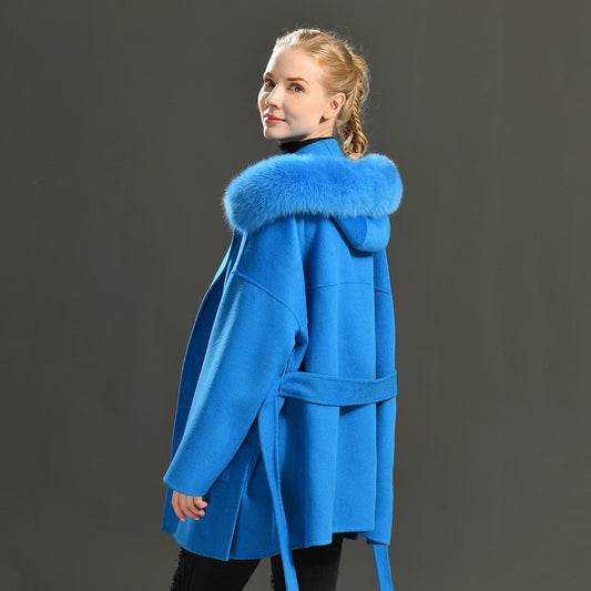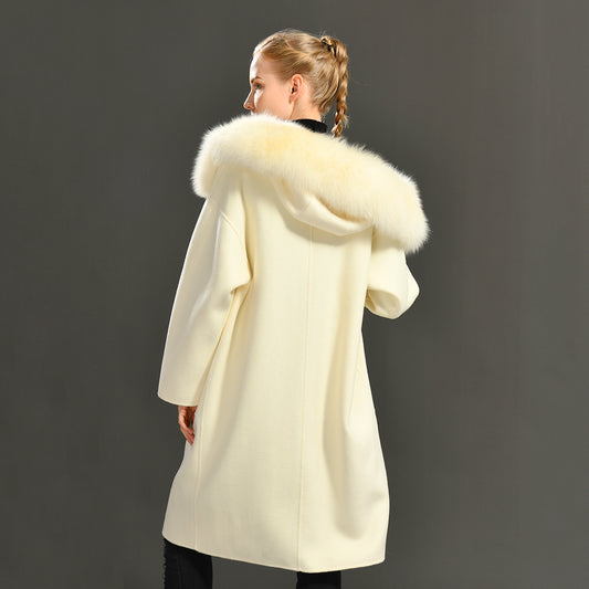 Jaxmonoy Oversize Loose Cashmere Wool Coat with Real Fox Fur Collar Winter Women Hood Outerwear Belt