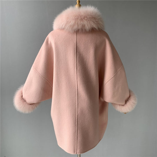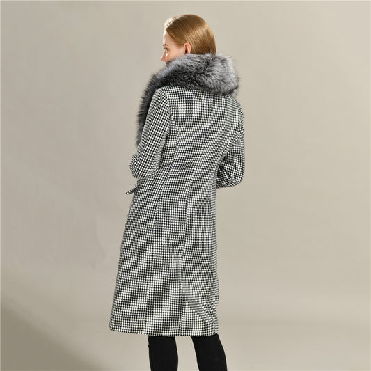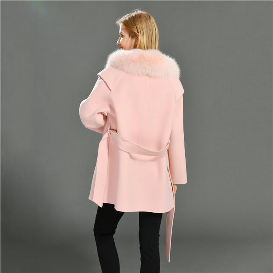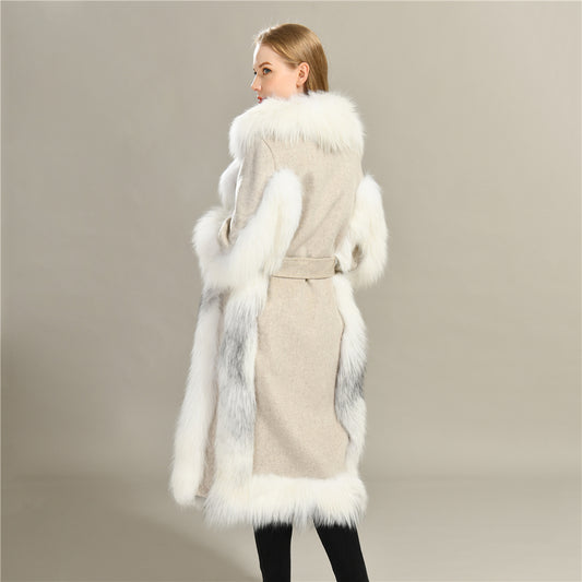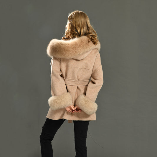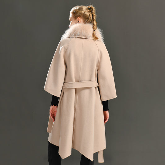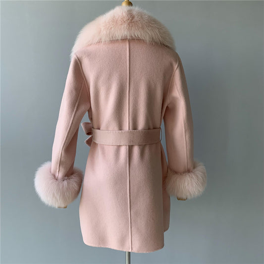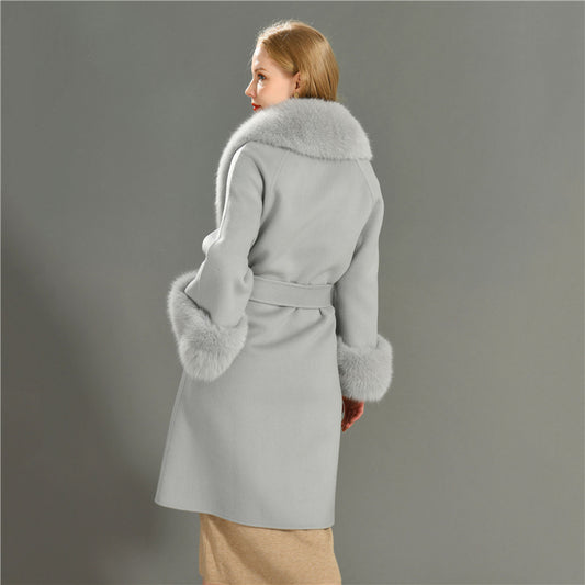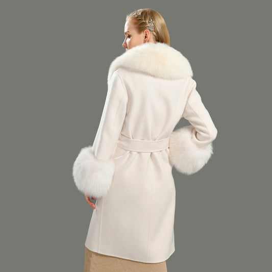 Jaxmonoy Ladies Cashmere Wool Coat Real Fox Fur Collar And Cuffs