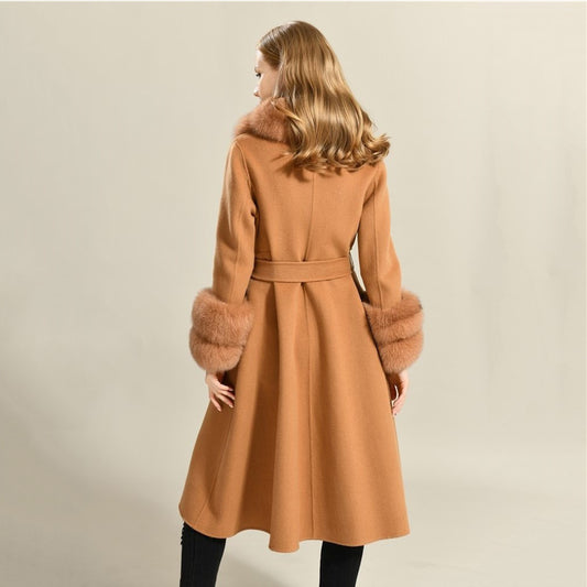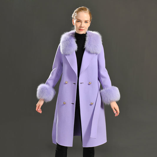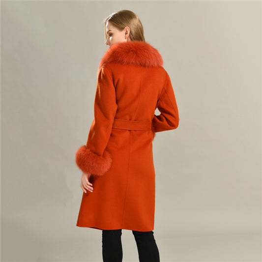 Jaxmonoy Slim Ladies Cashmere Coat Long Overcoat Real Fox Fur With Double-breasted