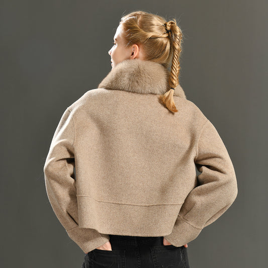 Jaxmonoy Women Cashmere Coat With Fur Collar Short Style