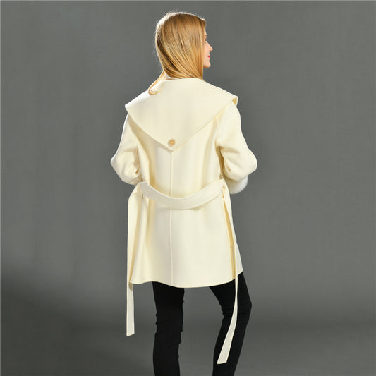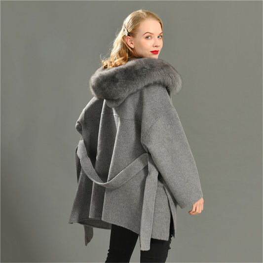 Jaxmonoy Double-faced Woolen Cashmere Coat Real Fox Fur Collar