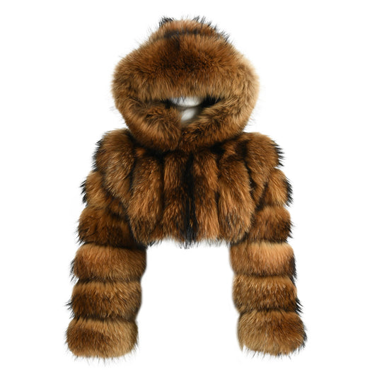 Winter Warm Fluffy Cropped Genuine Raccoon Fur Coat With Hood Women Custom Real Raccoon Fur Coat