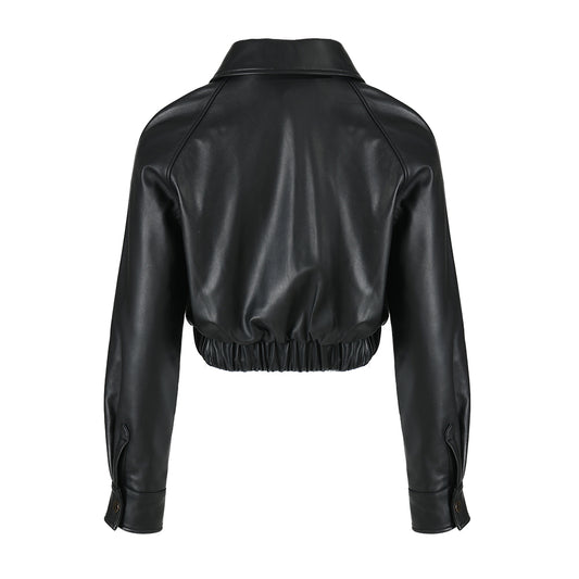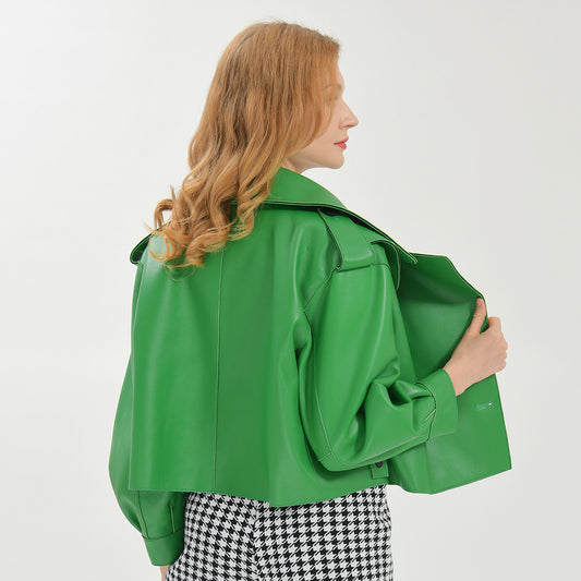 Cropped Turn-down Collar Real Sheepskin Leather Jacket For Women