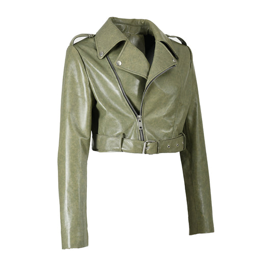 Spring Pure Color Genuine Leather Jackets With Belt And Zipper