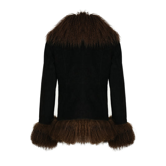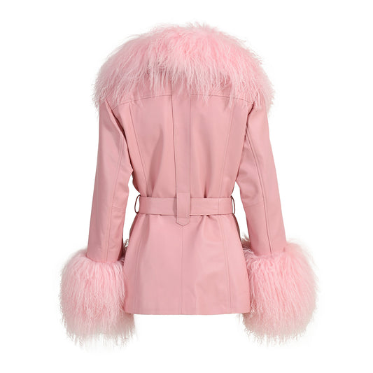 Short Length Real Leather Coat With Fluffy Mongolian Fur Collar And Cuffs